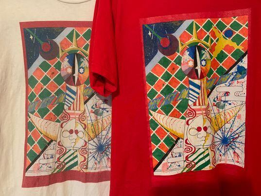 佐伯源士郎が2022年(当時14歳)に描いた「あ、じゃあもう太陽の塔で」をプリントした赤のTシャツです。サイズはMとLがあります。黒のロングTシャツと同じテカテカしたプリントになりますので、少しお値段が高くなってます。